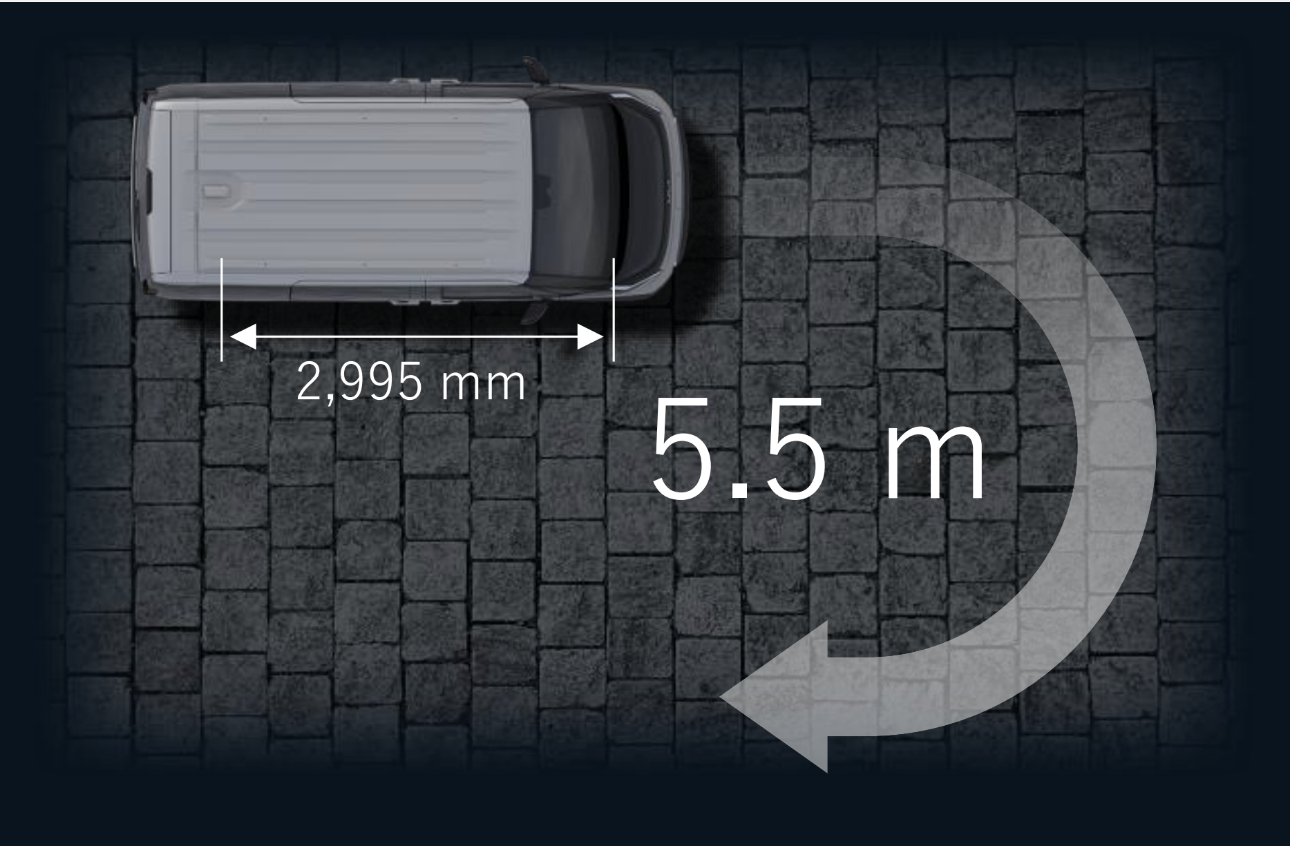 Med PV5 Passenger kan du enkelt navigere trange områder med skarpe vinkler. Å gjøre en 180 graders sving krever ikke mer en 5,5 meters bredde.